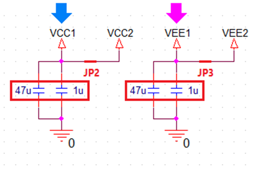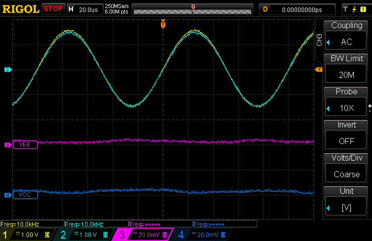 VCC, VEE 전원 라인에 Decoupling Capacitor를 미설치 상태로 초기 테스트 수행했을 때,