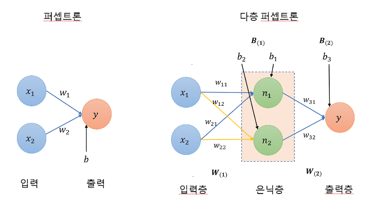 따라서, 최소 2개의 층이 필요한 다층 퍼셉트론 구조가 요구되는데 이를 위해 비선형 활성함수, 은닉층(Hidden Layer)을 추가한 다층 퍼셉트론(Multi-Layer Perceptron, MLP)이 개발되었고, 이러한 은닉층을 포함한 신경망이 발전하여 DNN(Deep Neural Network)로 불리게 되었다.